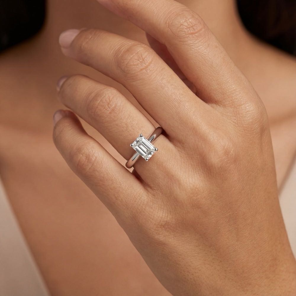 Stilvoller Ring mit einem hochkarätigen weißen Diamanten im Smaragdschliff, gefasst in einer edlen und zugleich schlichten Ringschiene aus hochwertigem Platin 950/-.