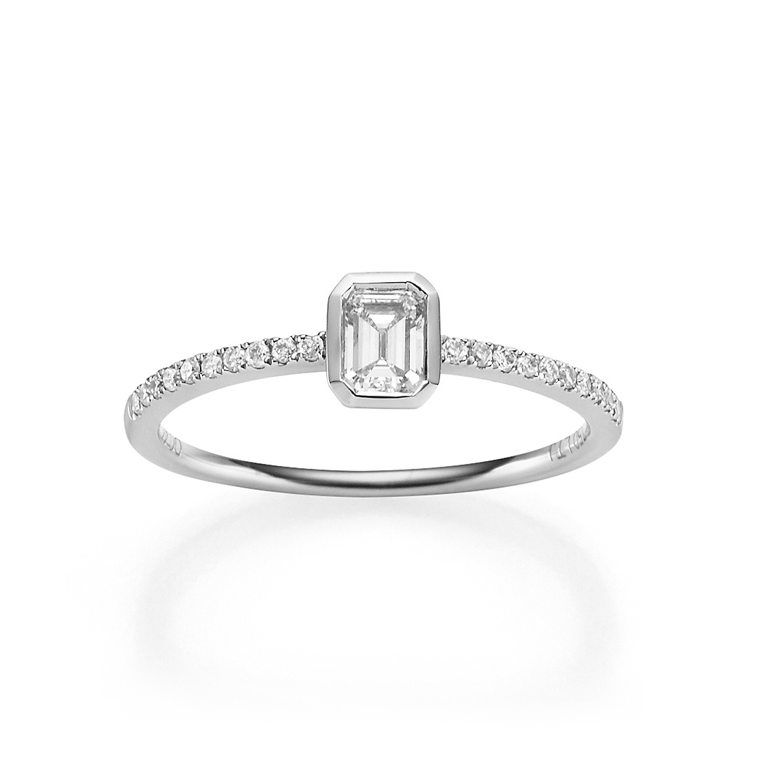 Zauberhafter Ring mit einem edlen weißen Diamanten im Smaragdschliff. Hervorragend zur Geltung kommt dieser feine Diamant in einer schlichten Ringschiene, gearbeitet in hochwertigem Weißgold 750/-. Auch diese zarte Ringschiene ist mit mehreren weißen Brillanten ausgefasst, woduch der einzelne Diamant im Smaragdschliff hervorragend akzentuiert wird.