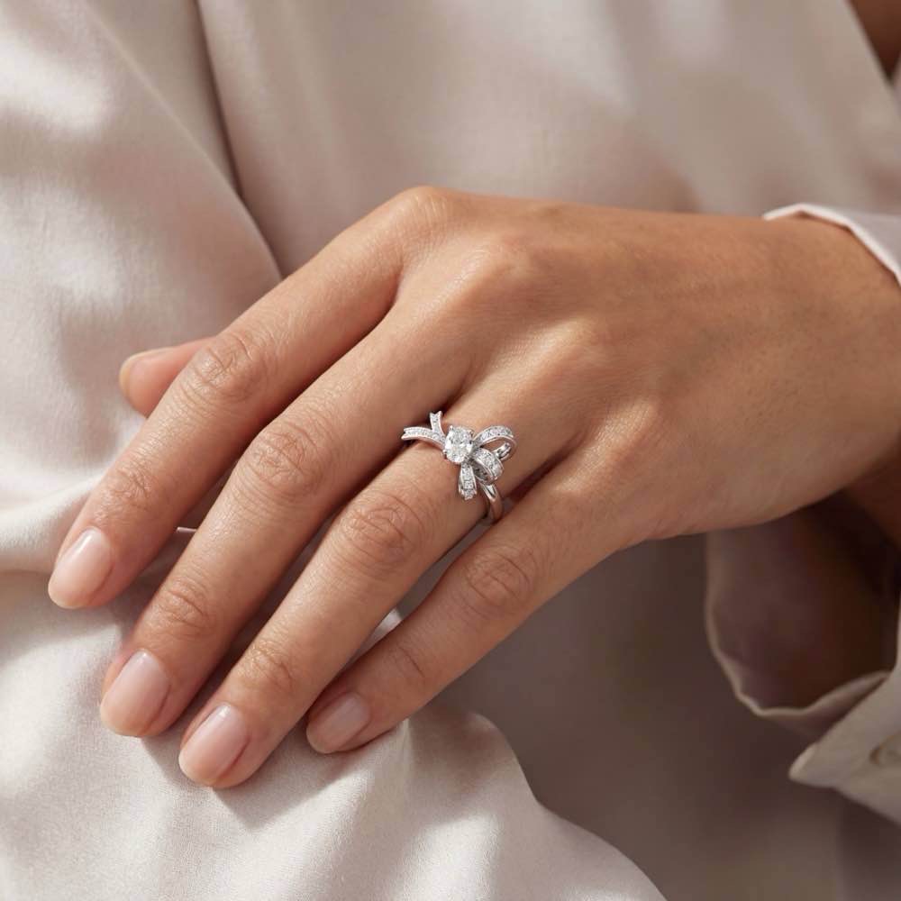 Außergewöhnlicher Ring mit einem fein weißem, lupenreinem ovalem Diamanten und mehreren fein weißen Diamanten im runden Brillantschliff. Eine charmante und edle Fassung, gearbeitet aus feinem Weißgold 750/- verleiht diesem Ring eine ganz besondere Ausstrahlung.