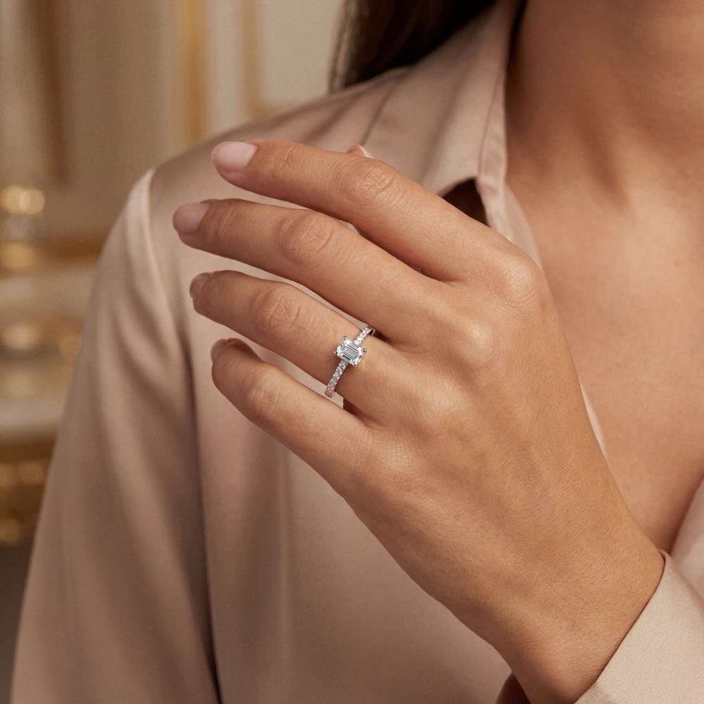 Ein faszinierender Ring mit einem zauberhaften weißen Diamanten im Smaragdschliff und flankierenden weißen Diamanten im Brillantschliff. Sehr stilvoll sind diese Diamanten gefasst in einer edlen Schiene aus Weißgold 750/-.