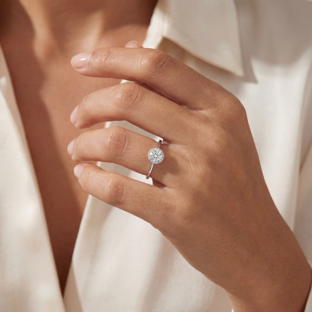 Klassischer Ring mit einem feinen weißen Brillanten, umgeben von einem dezenten Kranz kleinerer Diamanten im Brillantschliff. Gehalten von einer zierlichen Ringschiene aus zurückhaltend wirkendem Weißgold 750/-.
