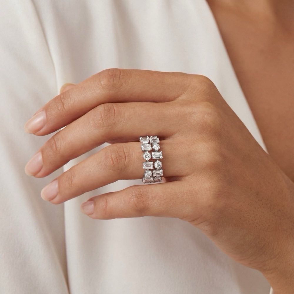 Hochkarätiger, charmanter Ring mit einer stilvollen Kombination aus Diamanten im runden Brillant- und achteckigen Emerald-Schliff. In feiner Handarbeit aus Weißgold 750/- gearbeitet.