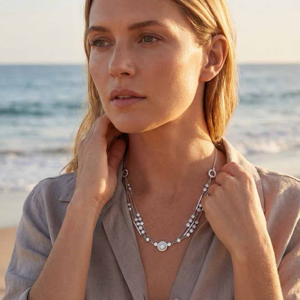 Charmant verspieltes Collier mit weißen Diamanten - im Zentrum mit einem feinen 1,31 Karäter. Die in mehrreihigen Ketten eingeflochtenen Diamanten in Brillenfassungen wechseln sich mit stabförmigen Zwischenteilen ab. In Handarbeit aus Weißgold 750/- gearbeitet.