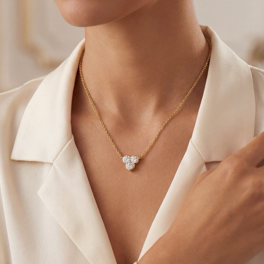 Klassischer und zugleich dezenter Halsschmuck mit drei weißen Brillanten. Dieses bezaubernde Collier wurde in hochwertigem Gelbgold 750/- in eigener Handarbeit in unserem Atelier gefertigt.