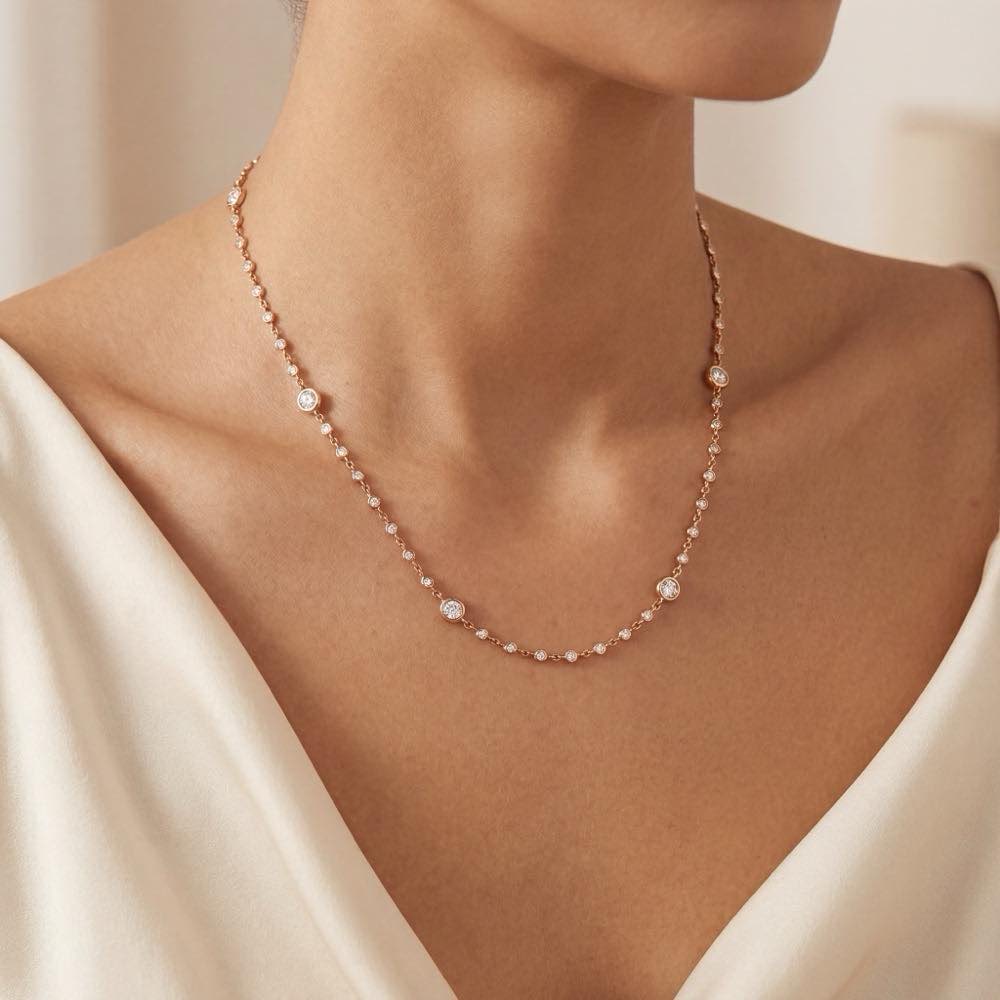 Stilvoller Halsschmuck in 42cm Länge mit mehreren hochwertigen Brillanten, die in einem zarten Sautoir aus edlem Roségold 750/-, fein und zierlich gefasst, sitzen.