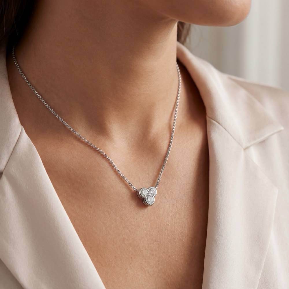 Bezaubernder Anhänger mit drei weißen Brillanten, in feinster Handarbeit aus edlem Weißgold 750/- gefertigt im eigenen Atelier.