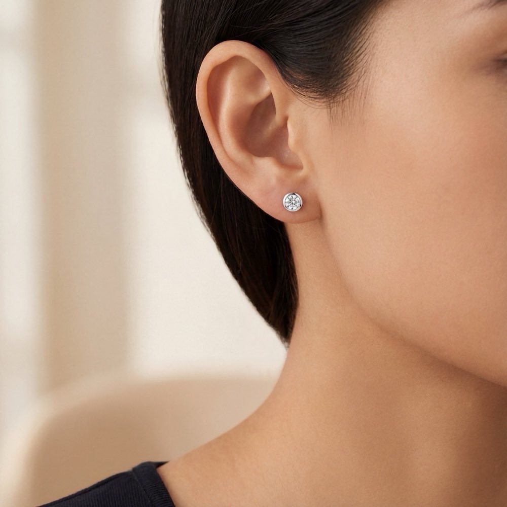 Zeitlose und stilvolle Solitär-Ohrstecker mit zwei hochkarätigen, in glänzend polierter Zarge gefassten Diamanten. In feiner Handarbeit aus Weißgold 750/- gearbeitet.