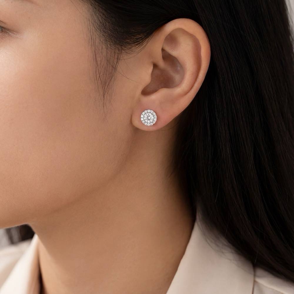 Zeitlose und stilvolle Ohrstecker mit zwei hochkarätigen Diamanten, umgeben von einem "Halo"-Diamantkranz. In feiner Handarbeit aus Weißgold 750/- gearbeitet.