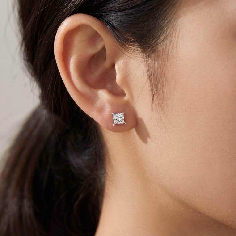 Zeitlose und stilvolle Solitär-Ohrstecker mit zwei hochkarätigen, in vier Krappen gefassten Diamanten im Princess-Schliff. In feiner Handarbeit aus Weißgold 750/- gearbeitet.
