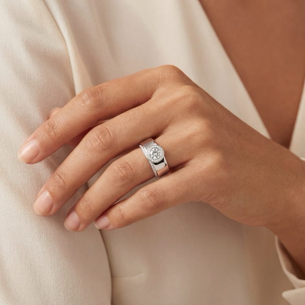 Modern interpretierter Solitärring mit weißen Diamanten. In feiner Handarbeit aus Weißgold 750/- gearbeitet.