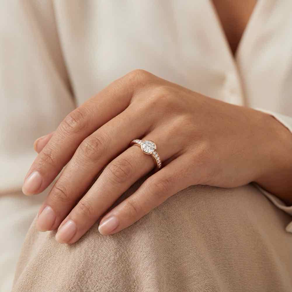 Charmanter Ring mit einem 1-karätigen Diamanten im Zentrum und weiteren seitlich gefassten Diamanten. In feiner Handarbeit aus Roségold 750/- gearbeitet.