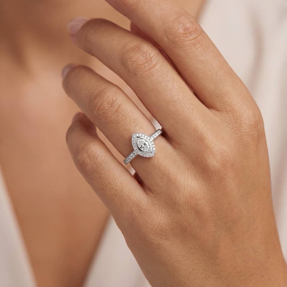 Charmanter und zeitloser Ring mit weißen Diamanten - im Zentrum mit einem Diamant im Navette-Schliff. In feiner Handarbeit aus Weißgold 750/- gearbeitet.