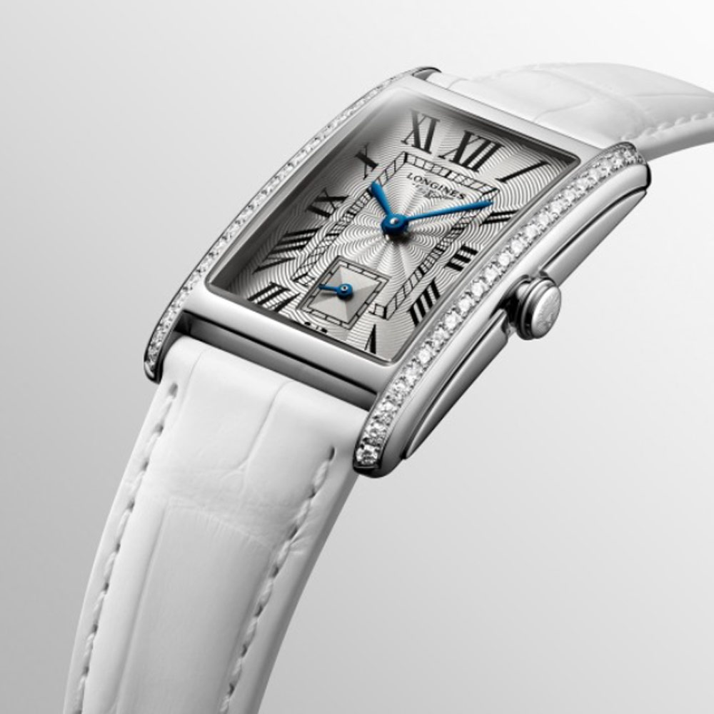 Longines DolceVita in einer rechteckigen Form mit silberfarbenem Zifferblatt. Kratzfestes Saphirglas, Quarzwerk, Alligatorlederband und Edelstahlgehäuse mit Diamanten besetzt.