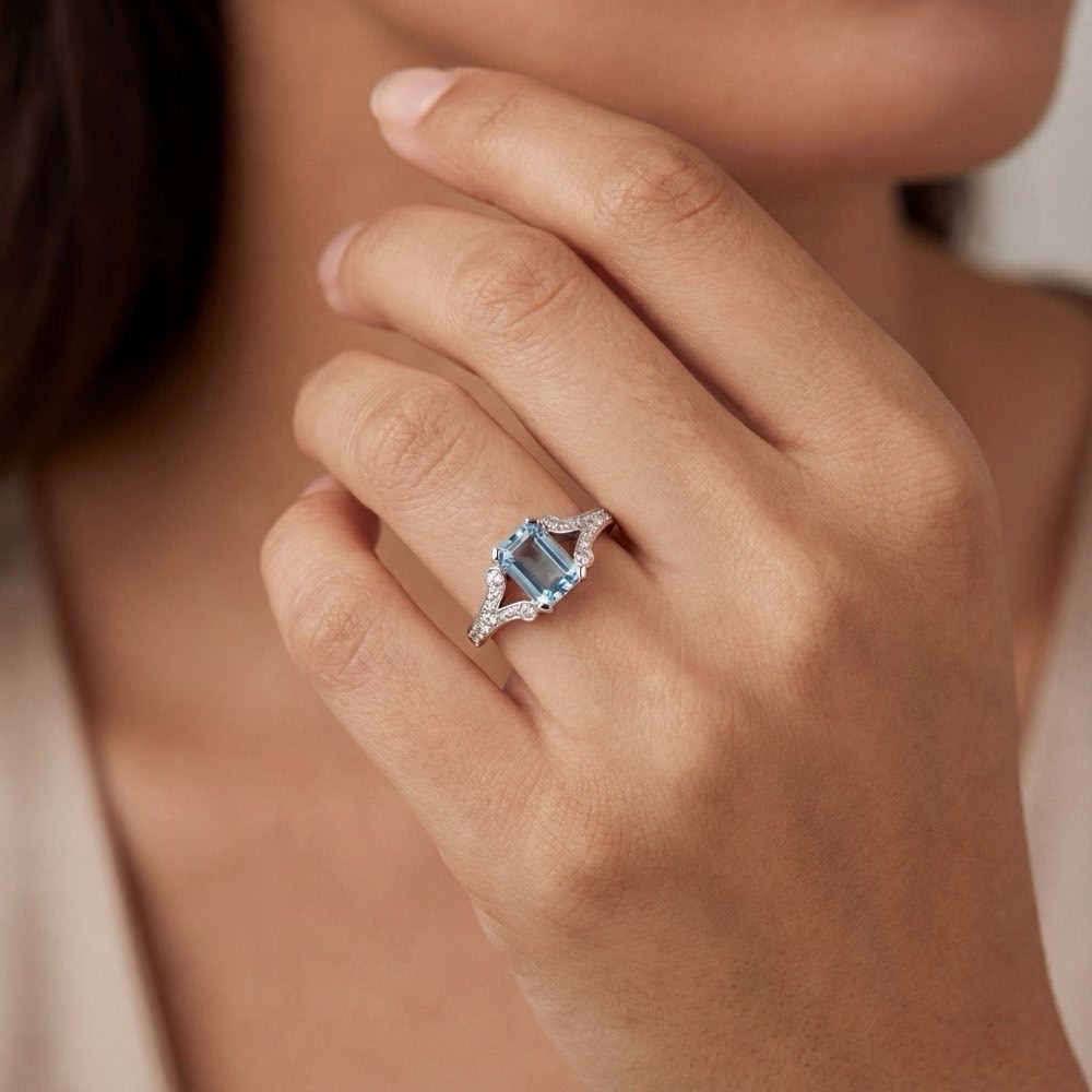 Formschöner Ring mit einem feinen, zartblauen Aquamarin im achteckigen Emerald-Cut. Mit weißen Diamanten zu 3/4 ausgefasste Ringschiene. In feiner Handarbeit in Weißgold 750/- gearbeitet.