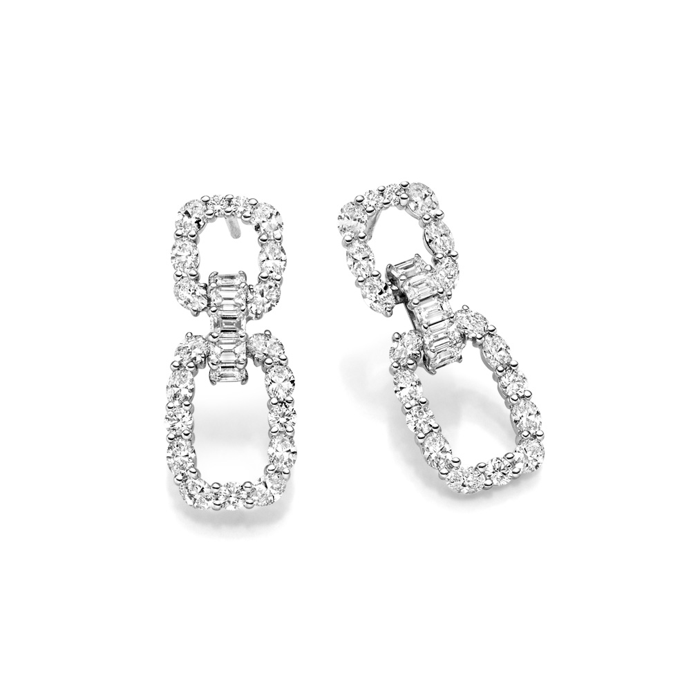 Charmanter Ohrschmuck mit weißen Diamanten in feinster Machart. Durch den Mix aus drei verschiedenen Schliffformen versprüht dieser Ohrschmuck Chic und Extravaganz. In feiner Handarbeit in Weißgold 750/- gearbeitet.