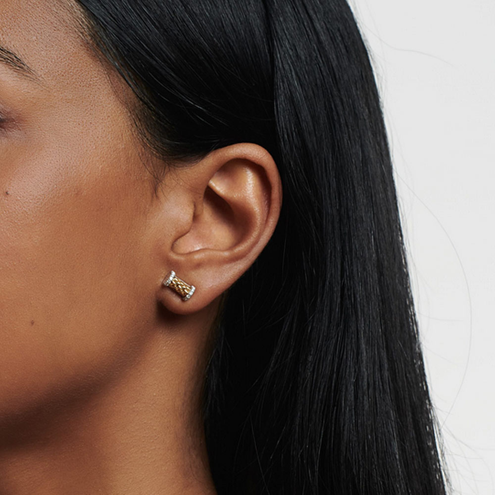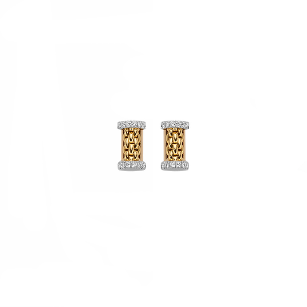 Edle FOPE Essentials Ohrstecker aus 18‑karätigem Gelb- und Weißgold, präzise gefasste Diamanten mit feiner Brillanz, dezentes Design für jeden Anlass, harmonisch kombinierbar und ideal für Liebhaberinnen klassischer Eleganz.