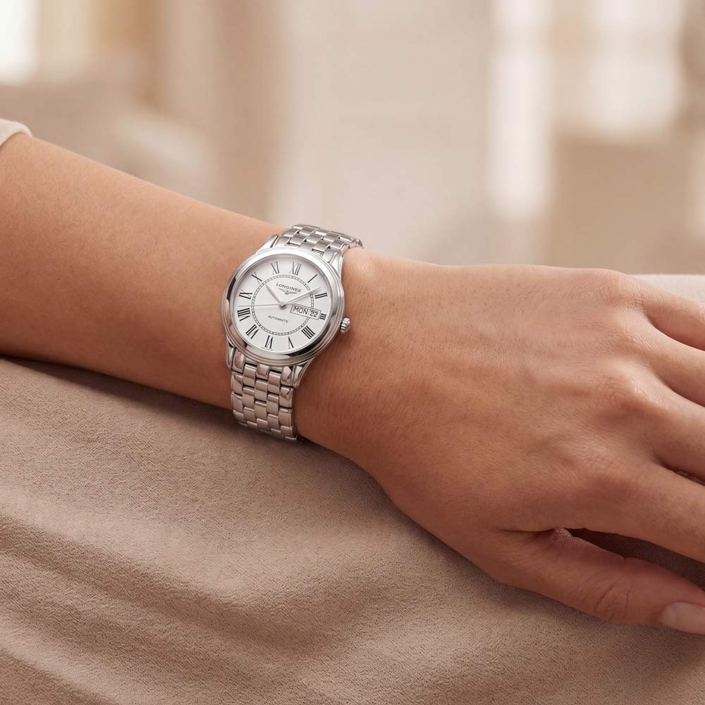 Die Longines aus der traditionsreichen Flagship Kollektion steht für klassische Uhrmacherkunst und zeitlose Eleganz. Die Flagship‑Linie ist ein fester Bestandteil der Marke und verkörpert Longines’ Anspruch auf Präzision, Beständigkeit und formale Klarheit. Das runde Edelstahlgehäuse mit einem Durchmesser von 38,5 Millimetern wirkt ausgewogen und angenehm schlank am Handgelenk. Polierte und satinierte Flächen verleihen der Uhr eine ruhige, hochwertige Ausstrahlung. Unter entspiegeltem, kratzfestem Saphirglas entfaltet sich das weiße Zifferblatt mit klassischen römischen Ziffern, silberfarbenen Zeigern und einer Datumsanzeige bei drei Uhr. Im Inneren arbeitet das Automatikwerk Longines Kaliber L636.5 mit einer Gangreserve von rund 38 Stunden. Durch den transparenten Gehäuseboden lässt sich die feine Mechanik beim Arbeiten beobachten – ein Detail, das Liebhaber mechanischer Uhren besonders schätzen. Abgerundet wird die Uhr durch ein Edelstahlarmband mit sicherer Faltschließe, das den klassischen Charakter unterstreicht und zugleich hohen Tragekomfort bietet. Mit einer Wasserdichtigkeit von 3 bar ist die Longines Flagship für den stilvollen Alltag bestens geeignet. Eine Uhr für Kenner, die klassische Ästhetik, zuverlässige Mechanik und die lange Tradition von Longines in einem souveränen Design vereint.