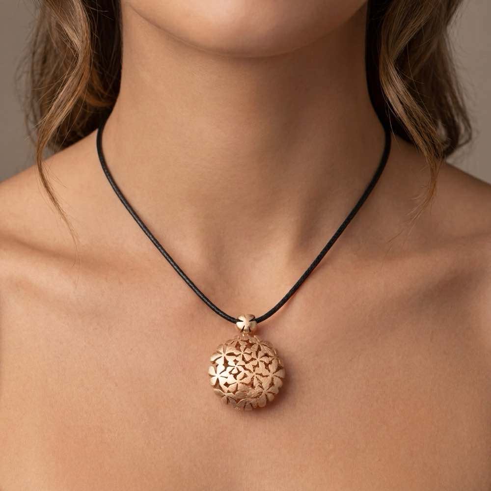 Fantasievoll verspielter Anhänger mit einem dekorativen Blumendecor. In feiner Handarbeit aus eismattem Roségold 750/- gefertigt.