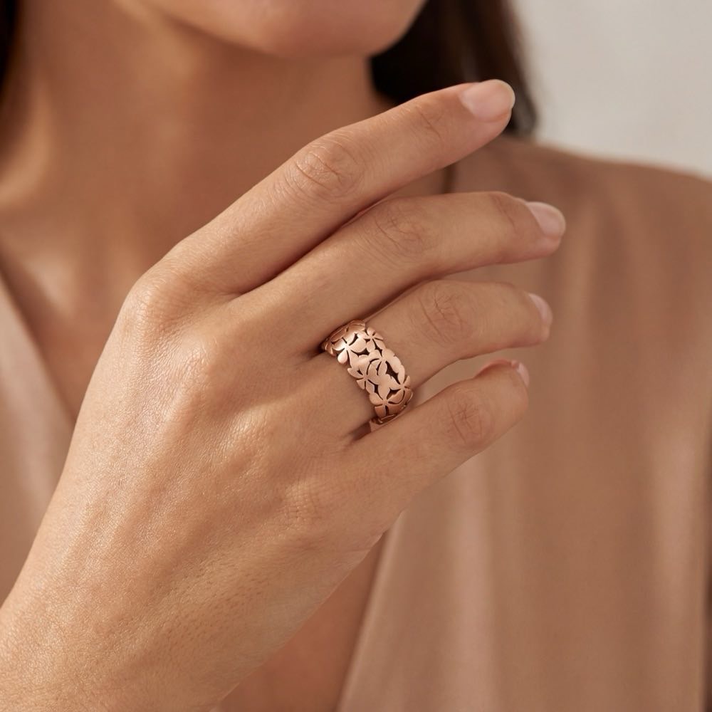 Fantasievoll verspielter Ring mit einem dekorativen Blumendecor. In feiner Handarbeit aus eismattem Roségold 750/- gefertigt.