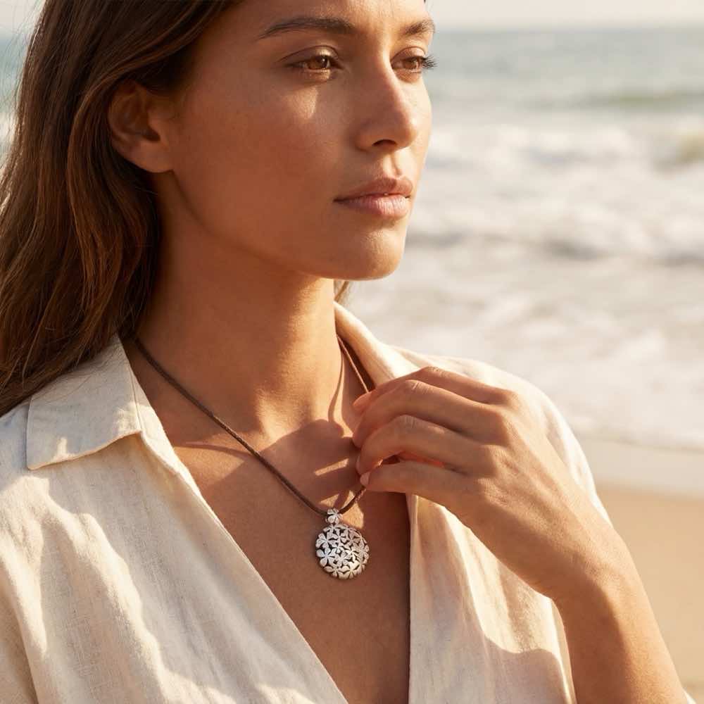 Fantasievoll verspielter Anhänger mit einem dekorativen Blumendekor. Mit fein weißen Diamanten im Brillantschliff. Von zwei Seiten tragbar: Vorderseite eismatt, Rückseite poliert. In feiner Handarbeit aus eismattem Weißgold 750/- gefertigt.