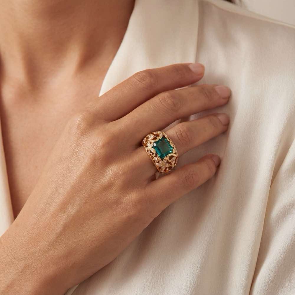 Fantasievoll verspielter Ring mit einem hochkarätigen, intensivgrün leuchtenden Turmalin und unzähligen weißen Diamanten. In feiner Handarbeit aus Roségold 750/- gefertigt.