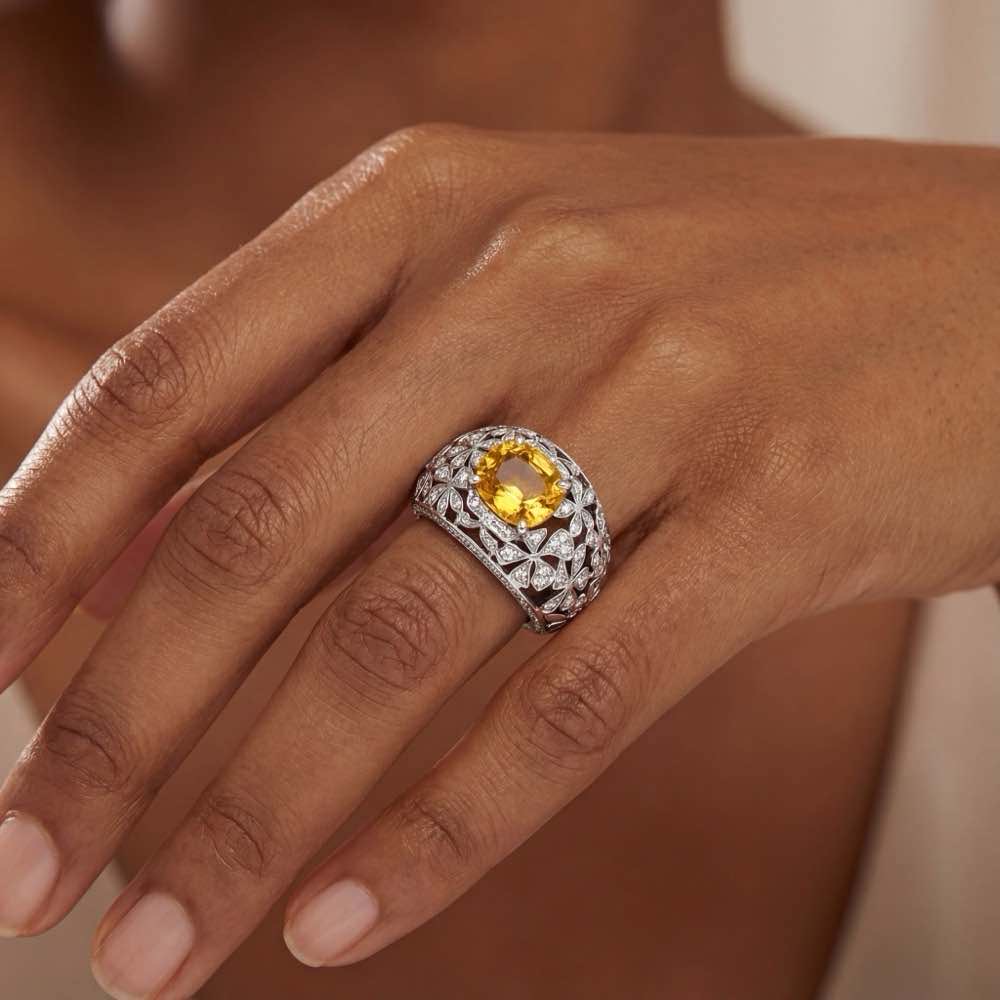 Fantasievoll verspielter Ring mit einem warmen, zitronengelb leuchtenden Saphir und unzähligen weißen Diamanten. In feiner Handarbeit aus Weißgold 750/- gefertigt.