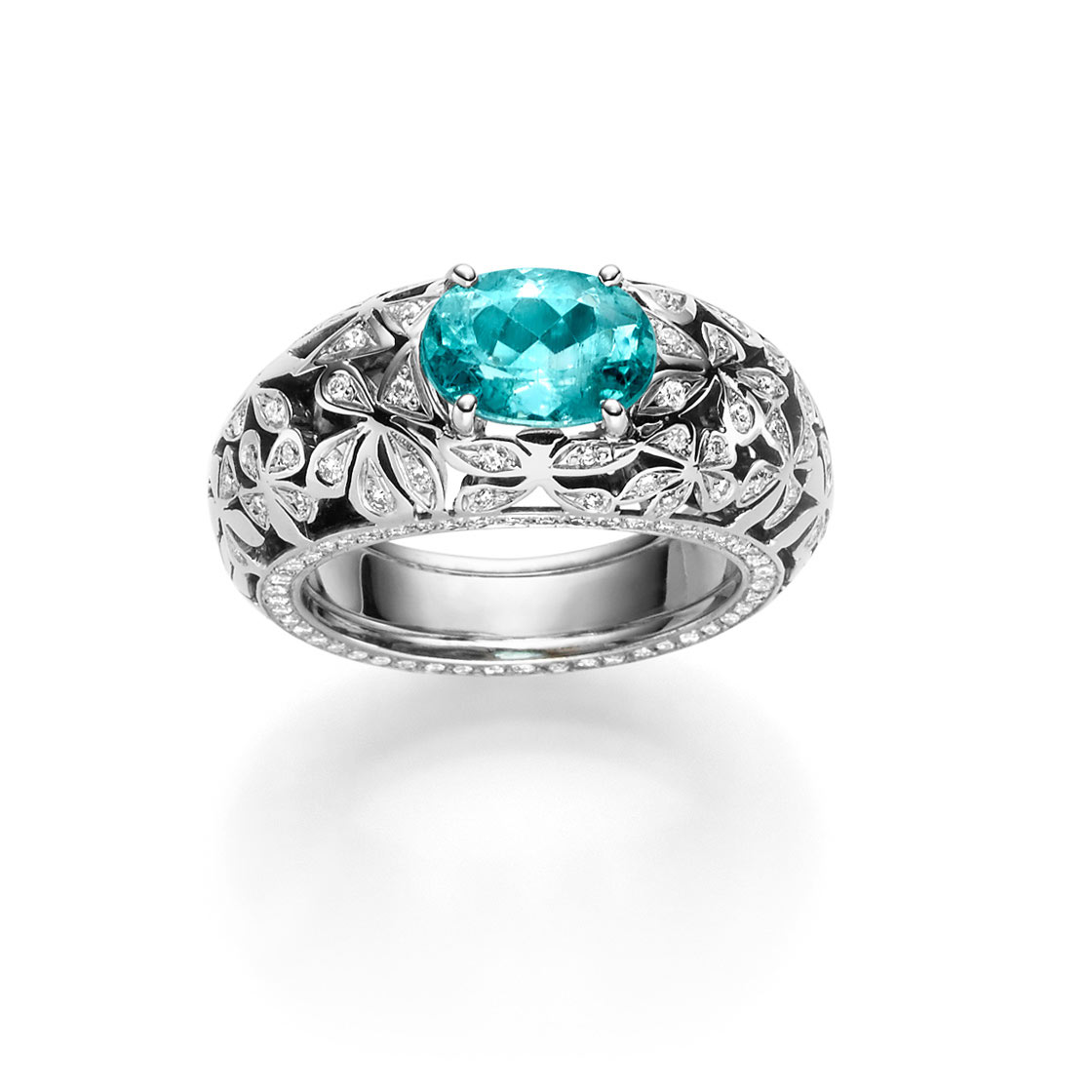 Fantasievoll verspielter Ring mit einem türkisblau leuchtenden Paraiba-Turmalin und unzähligen weißen Diamanten. Paraiba-Turmaline sind rare Sammlersteine und seltener als Diamanten. In feiner Handarbeit aus Weißgold 750/- gefertigt.