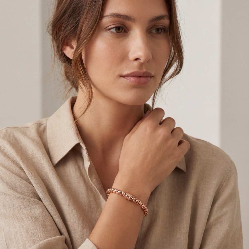 „Eka“ bedeutet im Sanskrit „Eins“ – und markiert den Beginn einer neuen Ära im Tragen von Goldarmbändern: elastisch, flexibel, ganz ohne Verschluss. Einfach überstreifen – und genießen. Das Besondere: Selbst der unsichtbare, flexible Kern besteht vollständig aus 18-karätigem Gold. Diese innovative Technik, eine hauseigene Erfindung aus den 1950er Jahren, nutzt FOPE bis heute – ein patentiertes Zusammenspiel von Handwerkskunst und High-End-Design. Das charakteristische goldene Gliedergeflecht vereint zeitlose Eleganz mit moderner Leichtigkeit – und macht Flex’it weltweit zu einem Symbol für luxuriöse Innovation.