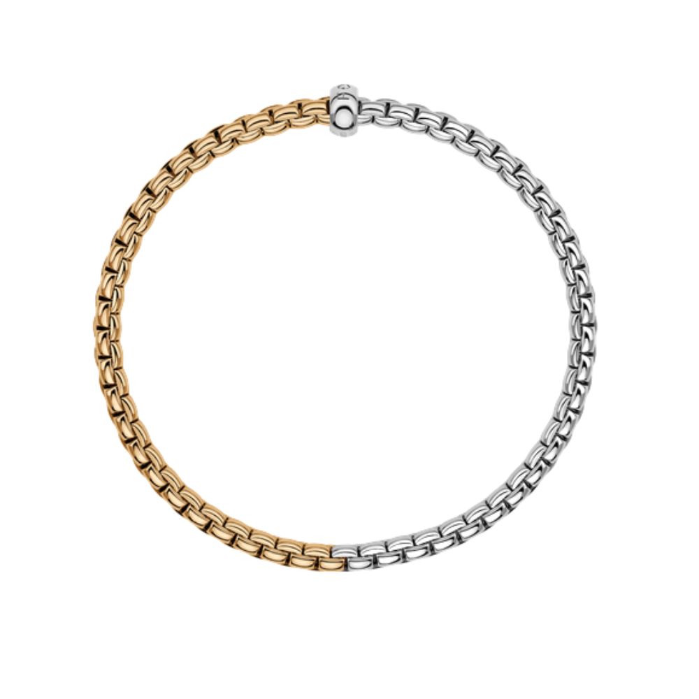 Hochwertiges Flex’it Armband aus 18‑karätigem Weiß‑ und Gelbgold, akzentuiert durch ein Goldrondell, angenehm elastisch für müheloses Anlegen, modern im Ausdruck und vielseitig kombinierbar innerhalb der Eka‑Kollektion.