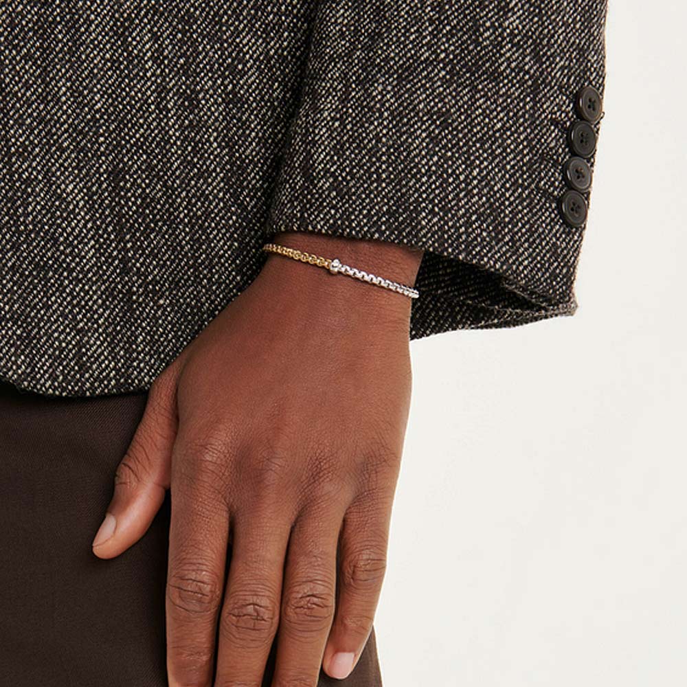 Das Flex’it Armband der Eka‑Kollektion besteht vollständig aus 18‑karätigem Gold und präsentiert ein kunstvoll gearbeitetes, zweifarbiges Geflecht, das dem Modell eine moderne und zugleich zeitlose Ausstrahlung verleiht. Ein sorgfältig ausgeführtes Goldrondell setzt einen dezenten Akzent und unterstreicht die elegante Linienführung des Designs. Dank der integrierten Flex’it‑Technologie lässt sich das Armband mühelos überstreifen und passt sich angenehm dem Handgelenk an – ganz ohne Verschluss. Die harmonische Kombination aus Handwerkskunst, Flexibilität und exklusiven Materialien macht dieses Schmuckstück zu einem vielseitigen Begleiter, der sowohl im Alltag als auch zu besonderen Anlässen seine Wirkung entfaltet.