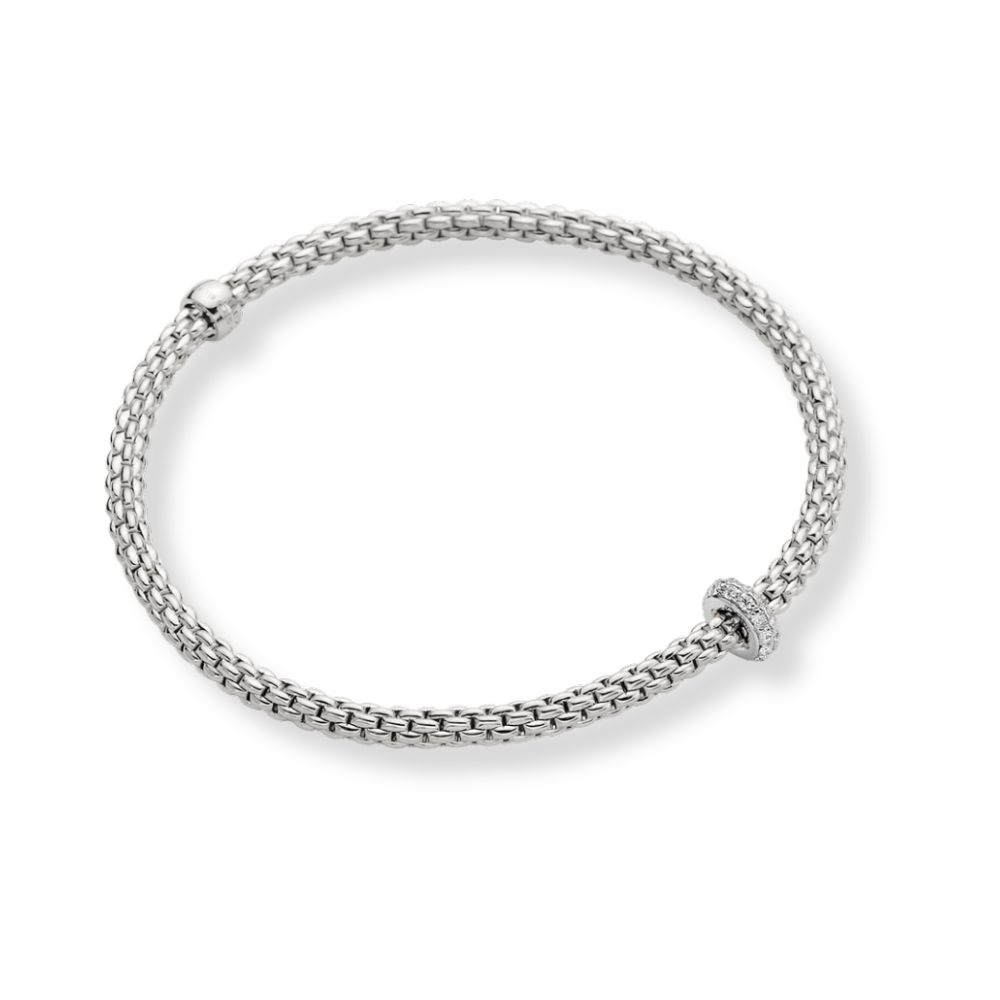Flexibles Armband aus 18 Karat Weißgold mit einem pavée diamantbesetztem Rondell. Durch die feine Machart und den dezenten Auftritt ist es der perfekte Begleiter für jeden Tag.