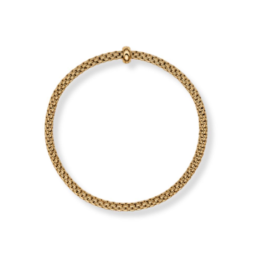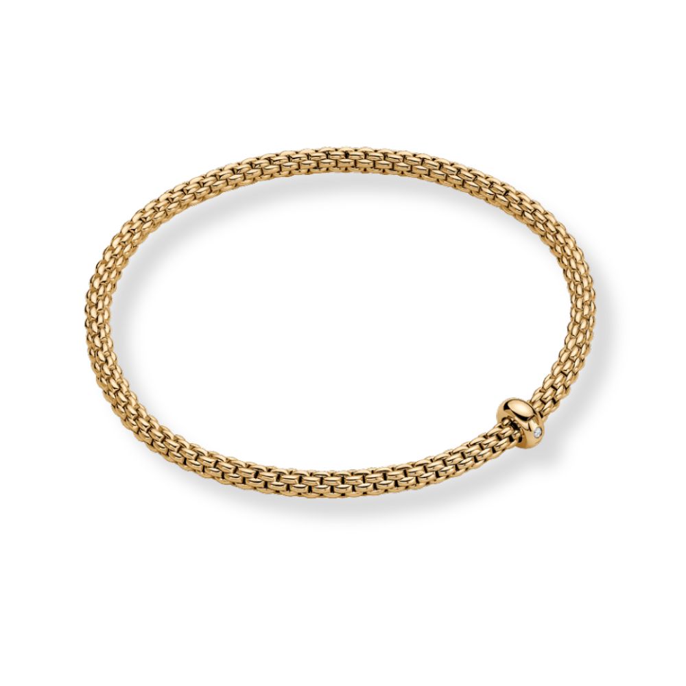 Elegantes Flex’it Prima Armband aus 18‑karätigem Gelbgold, fein gewobenes Goldgeflecht, elastische Konstruktion für müheloses Anlegen ohne Verschluss, akzentuiert durch einen funkelnden Brillanten. Modern einzeln tragbar und vielseitig kombinierbar mit weiteren FOPE‑Armbändern.