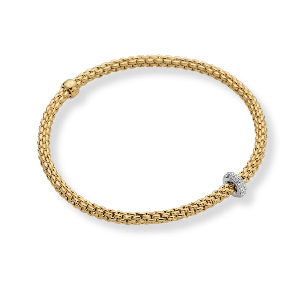 Flexibles Prima Armband aus 18‑karätigem Gelb‑ und Weißgold, das sich dank seiner feinen Goldstruktur angenehm um das Handgelenk legt. Ein Rondell mit Diamanten setzt den leuchtenden Akzent und unterstreicht die elegante Linienführung. Ein geschmeidiger Begleiter, der Schönheit und Leichtigkeit in einem Schmuckstück vereint.