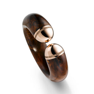 Extravaganter Ohrschmuck aus einer Kombination aus 18-karätigem Roségold und Holz gefertigt. Im Mittelpunkt stehen die zwei Farbedelsteine Morganit.