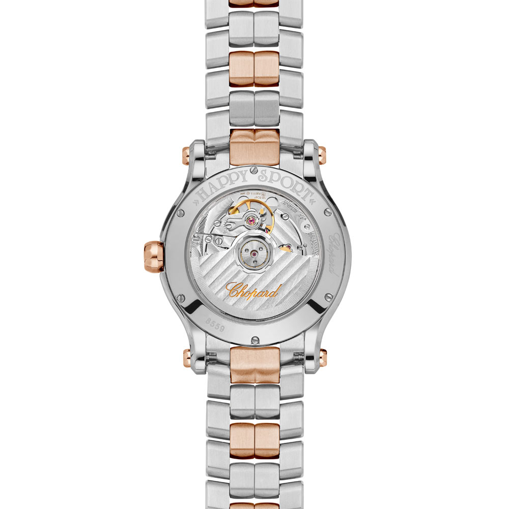 Chopard Happy Sport in 36 Millimeter Durchmesser, Zifferblatt silber mit Guillochierung in der Mitte, sieben "tanzende" Diamanten auf dem Zifferblatt. Entspiegeltes, kratzfestes Saphirglas, Mechanikwerk mit Automatikaufzug. Armband und Gehäuse in Edelstahl & 18 Karat Roségold.