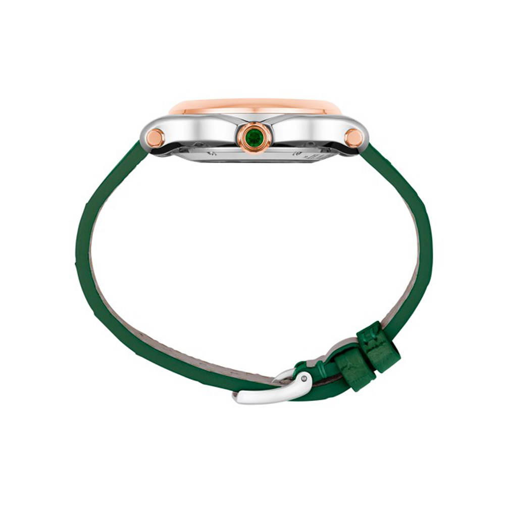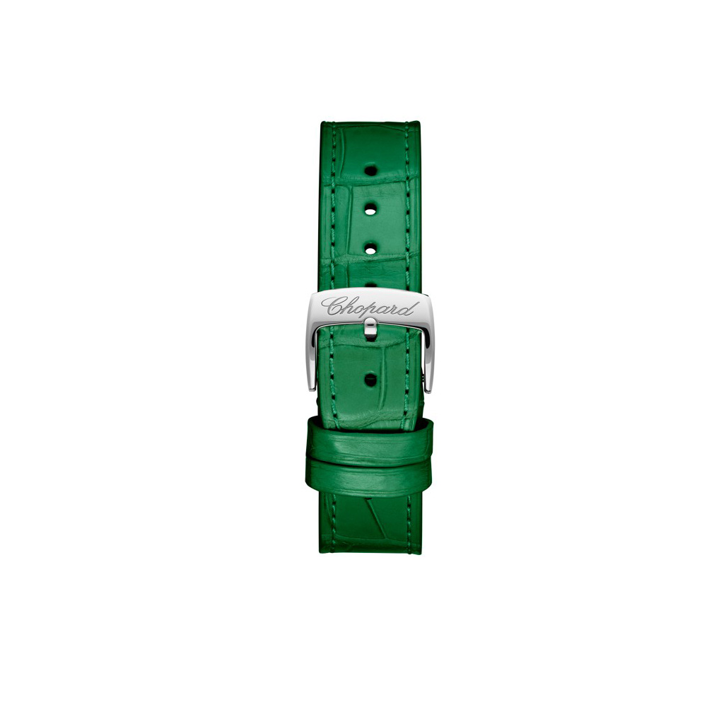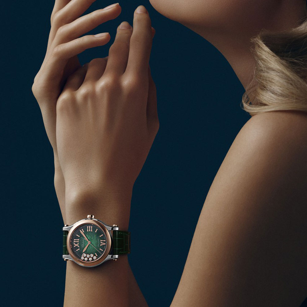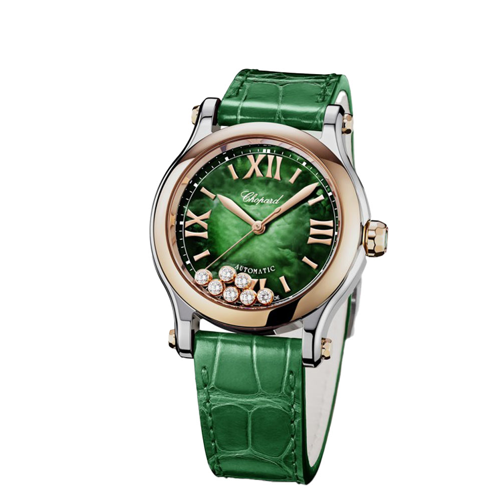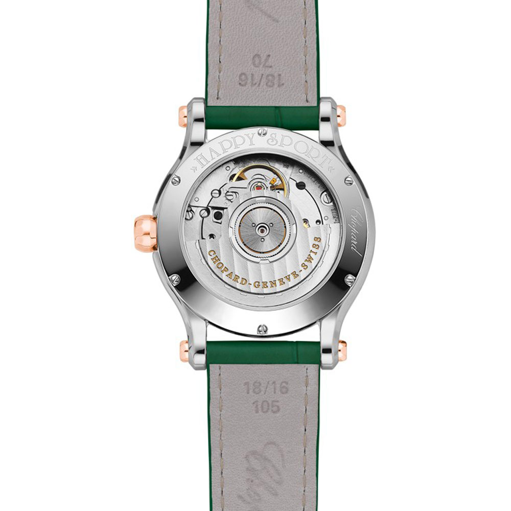 Chopard Happy Sport in 36 Millimeter Durchmesser, Zifferblatt grün, sieben "tanzende" Diamanten auf dem Zifferblatt. Entspiegeltes, kratzfestes Saphirglas, Mechanikwerk mit Automatikaufzug. Gehäuse in Edelstahl & 18 Karat Roségold. Armband Alligatorleder mit Dornschließe.