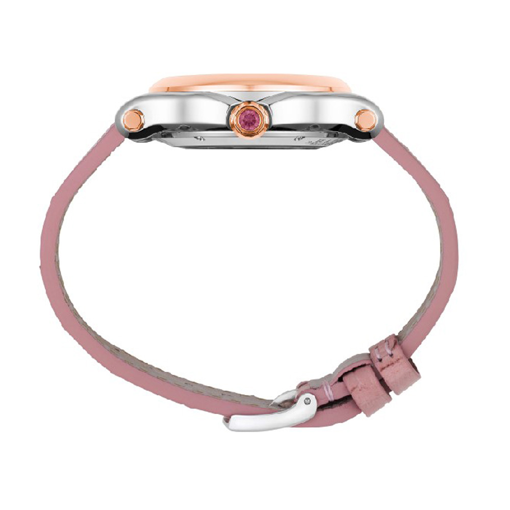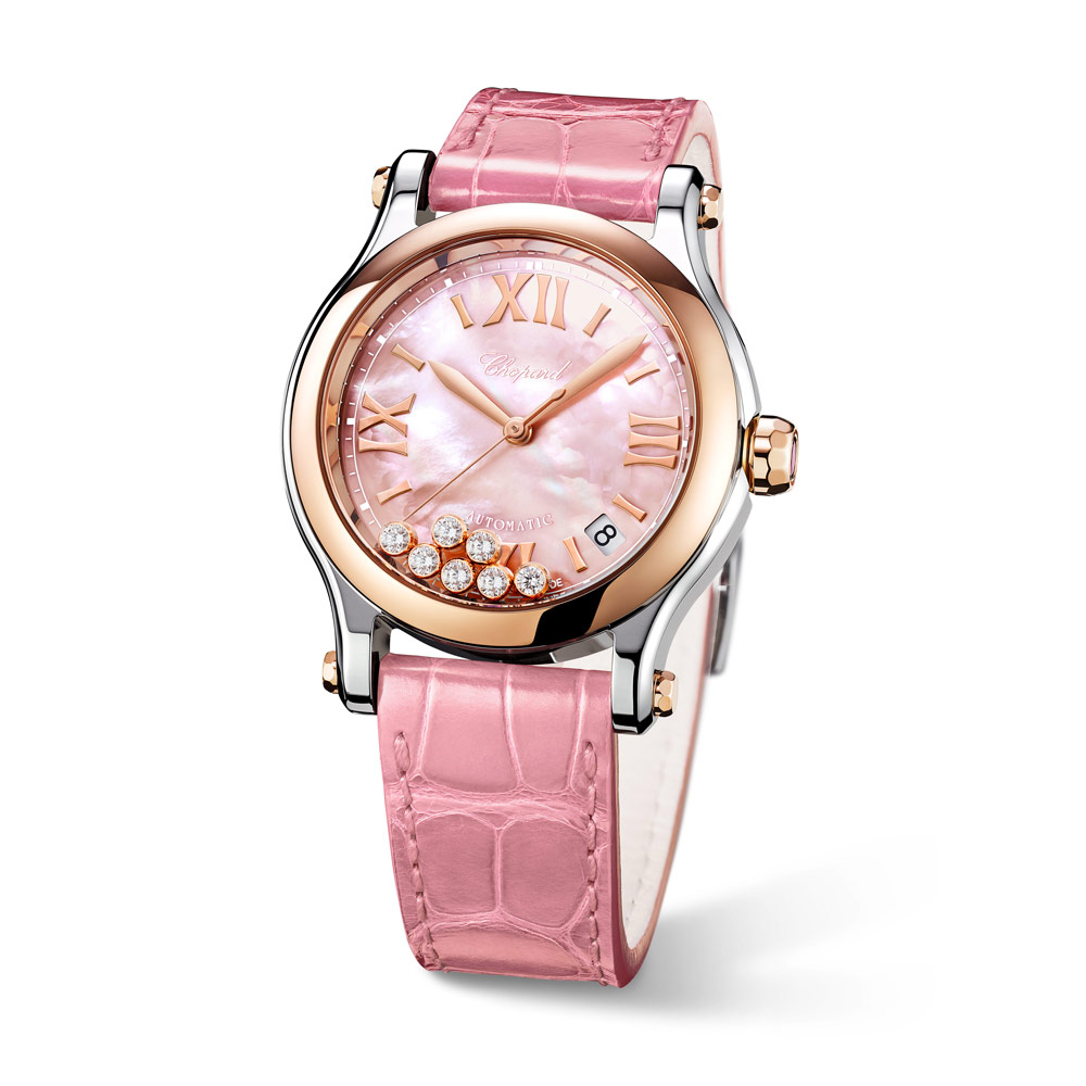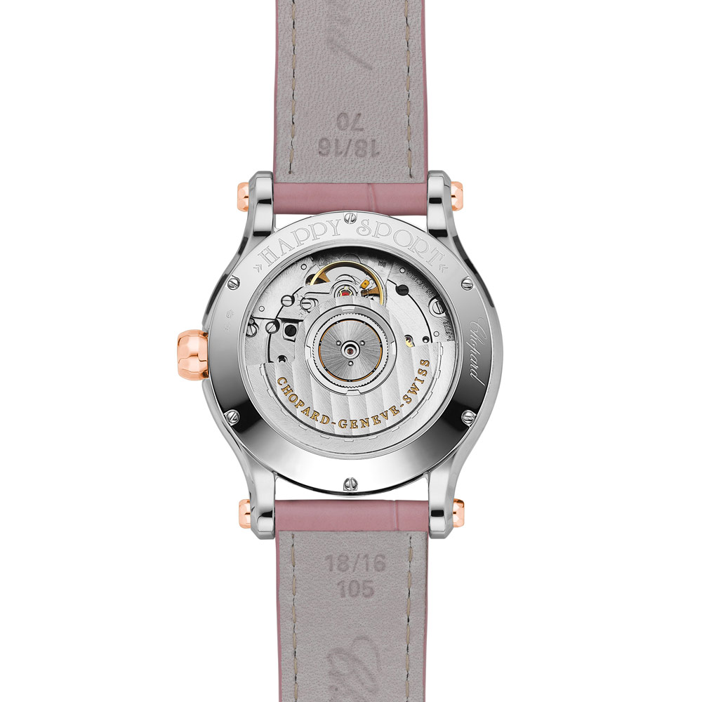 Chopard Happy Sport in 36 Millimeter Durchmesser, Zifferblatt Perlmutt rosa, sieben "tanzende" Diamanten auf dem Zifferblatt. Entspiegeltes, kratzfestes Saphirglas, Mechanikwerk mit Automatikaufzug. Gehäuse in Edelstahl & 18 Karat Roségold. Armband Alligatorleder mit Dornschließe.