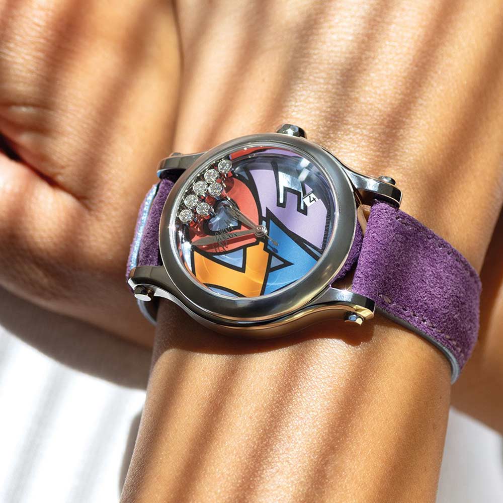 Chopard Happy Sport in 36 Millimeter Durchmesser, Zifferblatt blau mit buntem Schriftzug LOVE, sieben "tanzende" Diamanten auf dem Zifferblatt. Entspiegeltes, kratzfestes Saphirglas, Automatikwerk. Gehäuse in Edelstahl, Armband Leder mit Dornschließe.