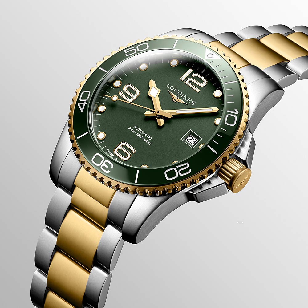 Longines HydroConquest in 41 Millimeter Durchmesser, Zifferblatt mattgrün. Kratzfestes Saphirglas mit mehreren Antireflexschichten, mechanisches Uhrwerk mit Automatikaufzug. Edelstahlarmband und gelbe PVD-Beschichtung, Gehäuse in Edelstahl und Keramik Lünette.