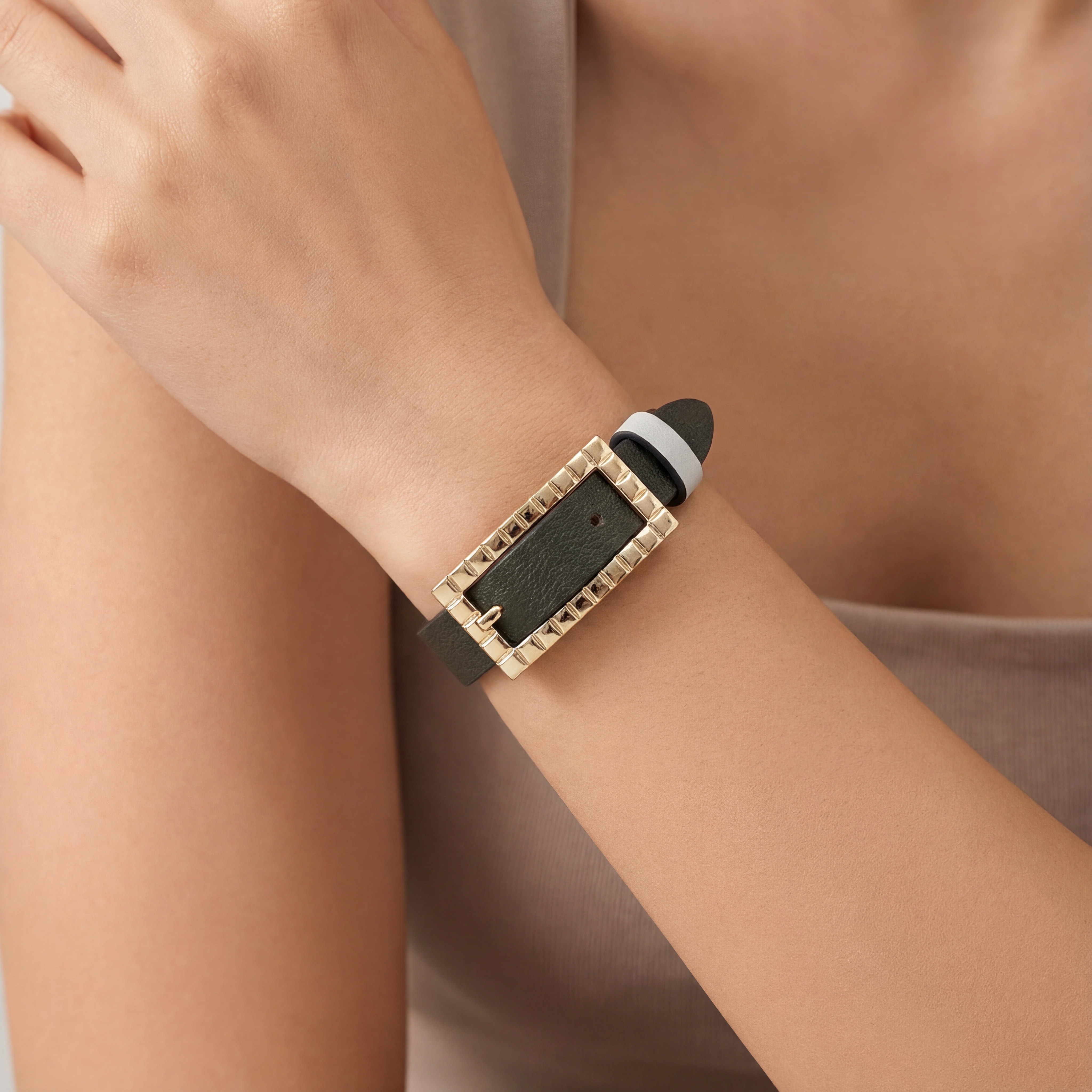 Elegantes Ice Cube Armband aus feinstem Leder in Creme und Khaki. Dank wendbarem Design entstehen zwei Looks in einem. Die hellgoldfarbene Schließe im ikonisch facettierten Design der Ice Cube Kollektion verleiht modernen, vielseitigen Chic.
