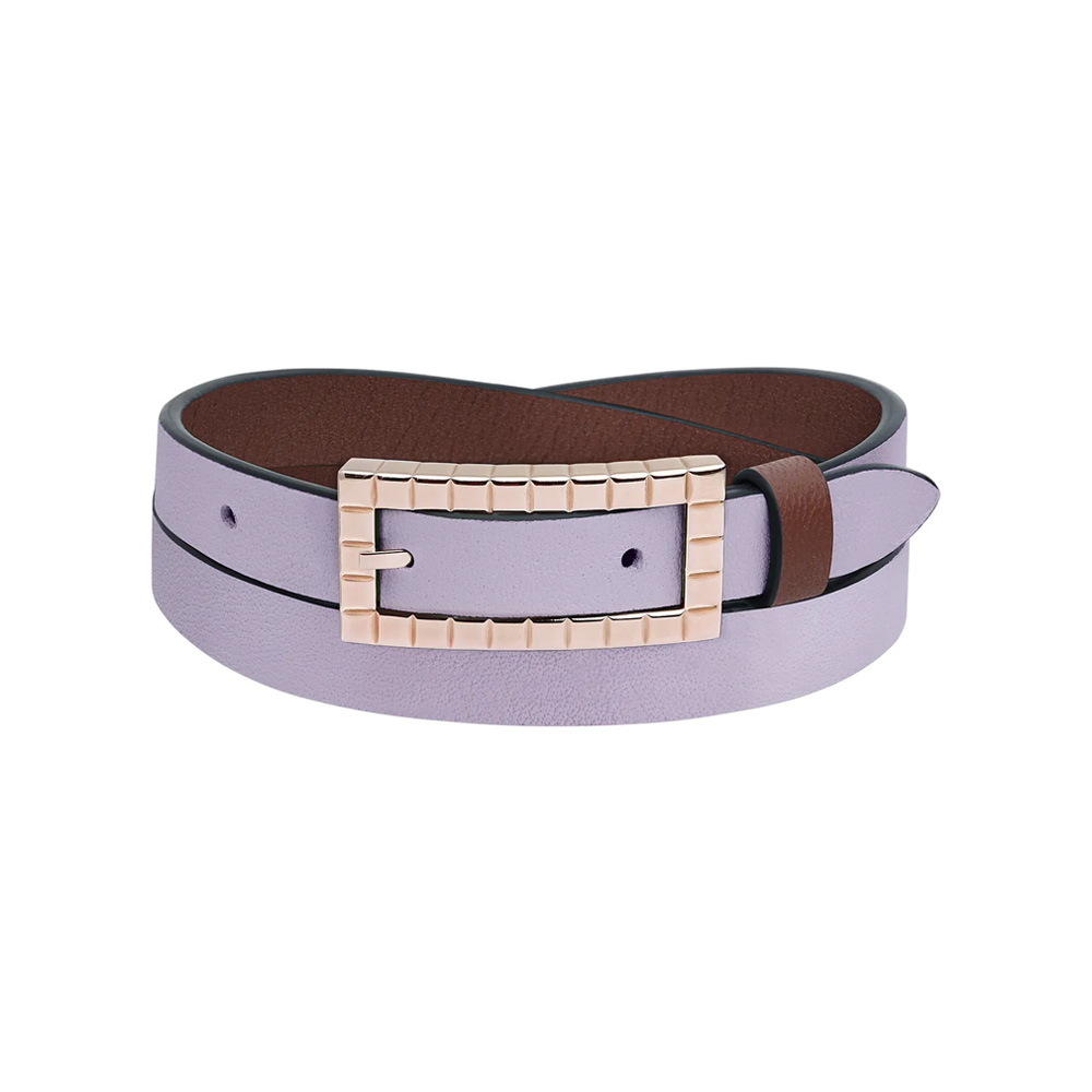 Ice Cube Armband aus Leder in Braun und Lila – wendbar für zwei Looks. Mit hellgoldfarbener Schließe im ikonisch facettierten Design. Modern, vielseitig, stilvoll.