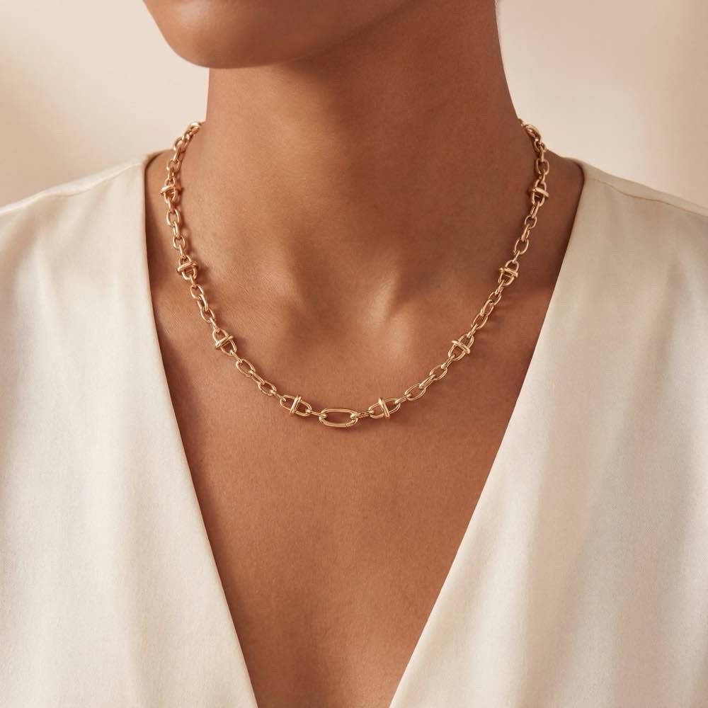 Das Iconica-Collier aus strahlendem Gelbgold überzeugt mit präzise gearbeiteten Gliedern, die sich zu einer ausgewogenen, fließenden Form vereinen. Ob als Solist oder im Zusammenspiel mit weiteren Schmuckstücken getragen – dieses Collier setzt ein stilvolles Statement und lädt dazu ein, Stärke und Eleganz neu zu interpretieren.