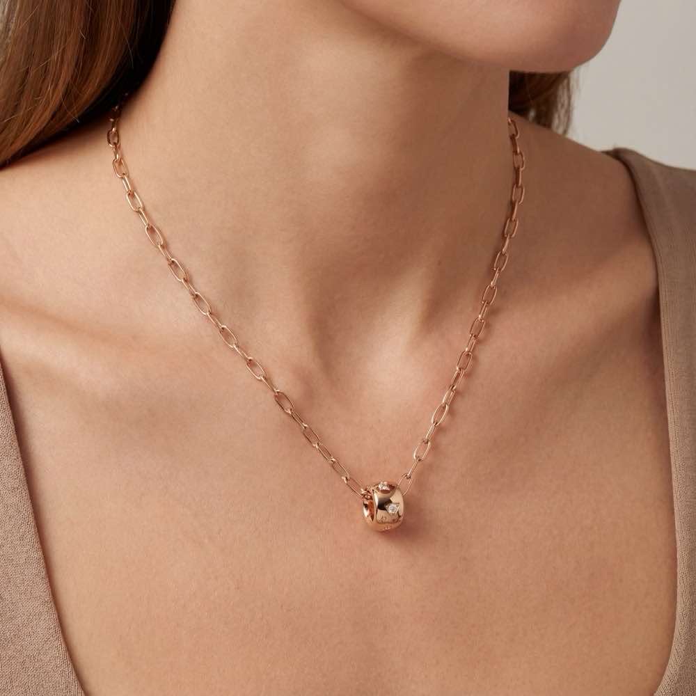 Schlichter Halsschmuck mit unverkennbarem Mailänder Chic. Mit dezenten Farbedelsteinen besetzt und aus edlem, 18-karätigen Roségold gefertigt. Die Kette ist variabel und kann in drei Längen getragen werden.