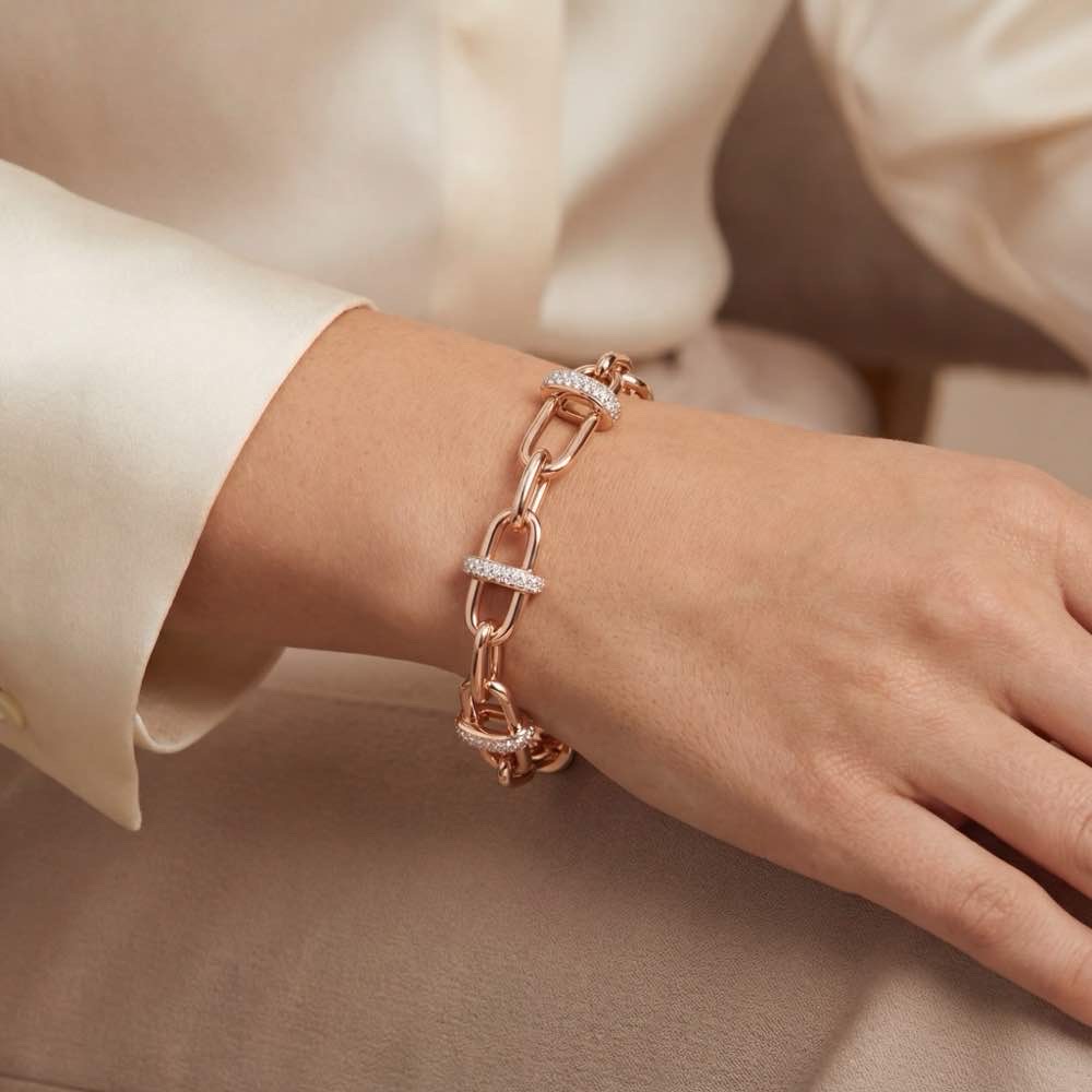 Iconica Armband – ein Statement in Roségold, veredelt mit 273 funkelnden Diamanten, die das Licht in jedem Moment einfangen. Unverkennbar ikonisch – kraftvoll, ausdrucksstark, zeitlos. Ein Schmuckstück, das nicht nur getragen wird, sondern Geschichten erzählt. Für alle, die ihre Persönlichkeit mit Glanz und Stärke unterstreichen möchten.
