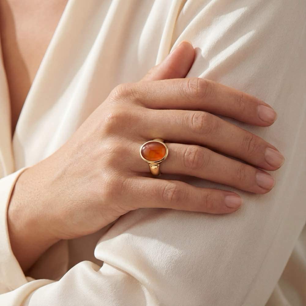 Siegelring aus 18-karätigen Gelbgold mit einem Karneol als Wappenstein. Durch eine Gravur machen Sie diesen Ring zu einem Unikat. Die Gravur kann ein Wappen sein, aber auch Initialen oder jedes andere Motiv. Als Edelstein sind diverse Varianten möglich. Hierzu erfahren Sie mehr in dem untenstehenden Bericht über Siegelschmuck. Alle gezeigten Siegelringe sind sowohl als Damen- oder Herrenring erhältlich. Natürlich beraten wir Sie auch gerne persönlich oder fernmündlich.