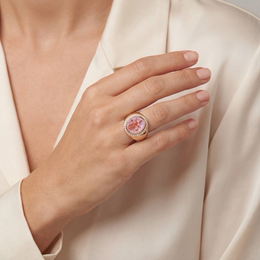 Siegelring aus 18-karätigen Roségold mit einem Lagenstein aus rotem Karneol und fliederfarbenem Achat. Die abgebildete Wappengravur ist ein Beispiel und wird nach Ihren individuellen Wünschen graviert. Dies kann ein Wappen sein, aber auch Initialen oder jedes andere Motiv. Als Edelstein sind diverse Varianten möglich. Hierzu erfahren Sie mehr in dem untenstehenden Bericht über Siegelschmuck. Alle gezeigten Siegelringe sind sowohl als Damen- oder Herrenring erhältlich. Natürlich beraten wir Sie auch gerne persönlich oder fernmündlich.