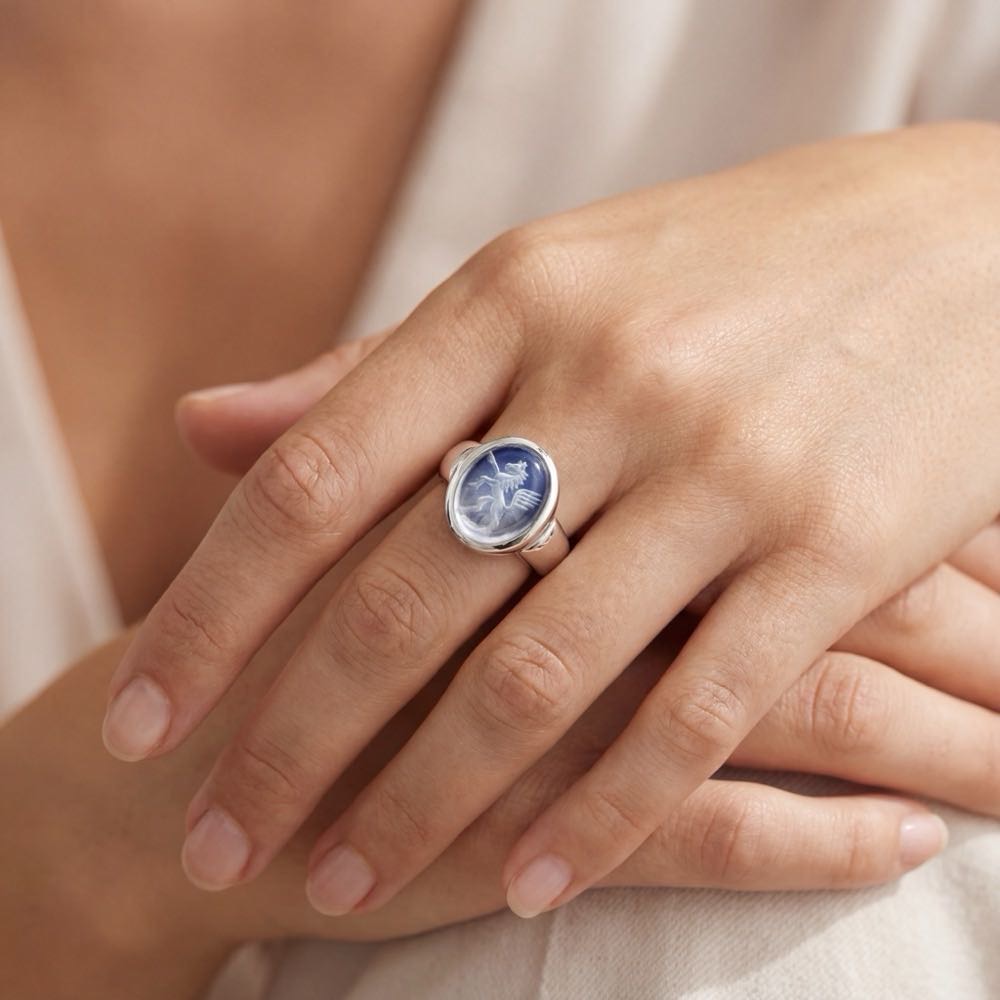 Lagensteine verleihen dem Gravurbild Ihres Siegelrings durch ihre Zweifarbigkeit einen ansprechenden Kontrast.  Der blaue Lagenachat ist der beliebteste Gravurstein und ist in zwei Varianten erhältlich: entweder in dunkelblauer oder in mittelblauer Oberseite. Die untere Schicht, in der graviert wird, ist in beiden Fällen schwarz. Auch die roten Lagensteine, bekannt als Lagencarneole, können in verschiedenen Helligkeitsstufen bestellt werden, die unterschiedlich viel von dem Rot des Carneols durchscheinen lassen. Die Gravur des Wappens oder Monogramms erscheint stets in Rottönen, während die obere Schicht oft einen zarten fliederfarbenen Schimmer hat.