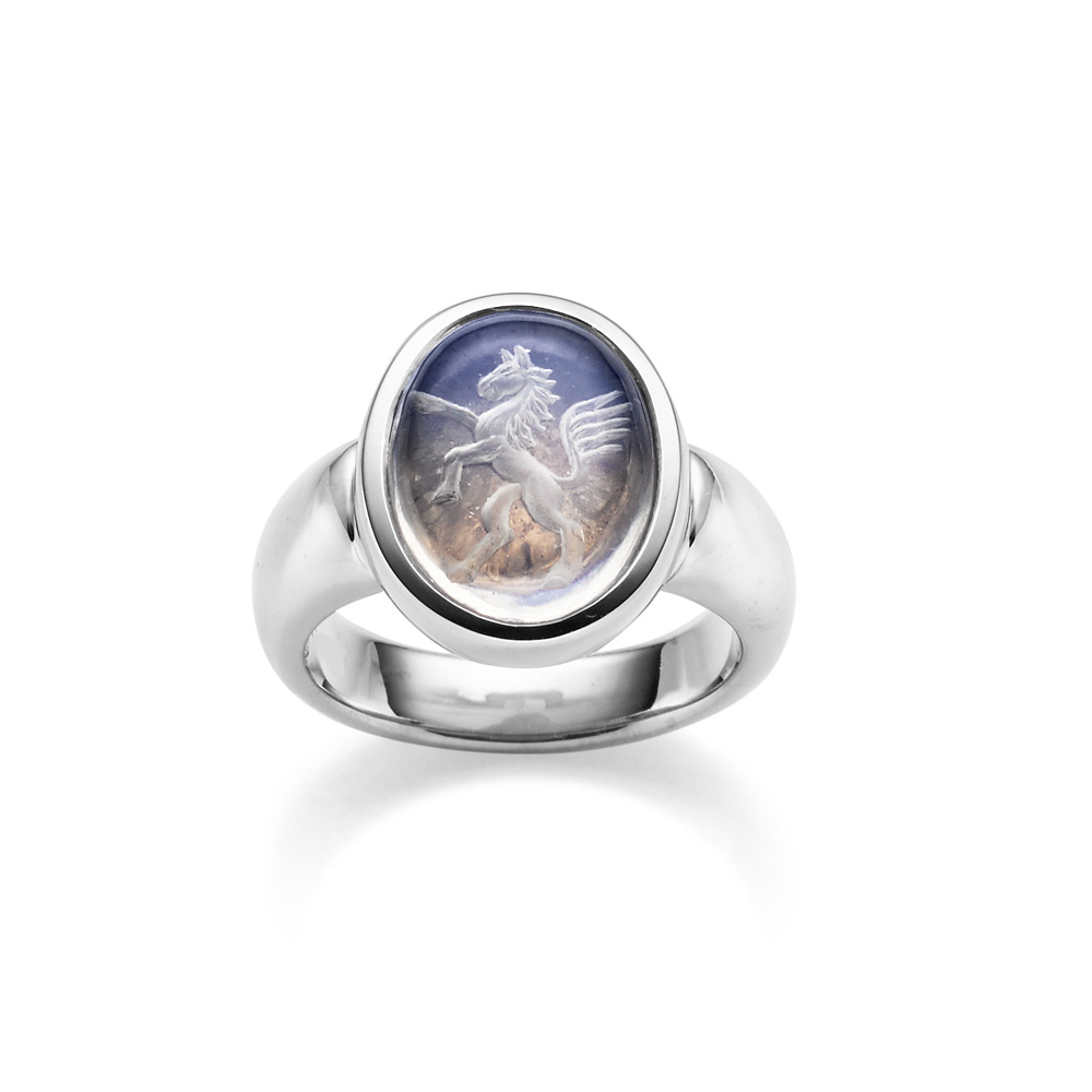 Siegelring aus 18-karätigen Weißgold mit einem rückseitig graviertem Mondstein. Die abgebildete Wappengravur ist ein Beispiel und wird nach Ihren individuellen Wünschen graviert. Dies kann ein Wappen sein, aber auch Initialen oder jedes andere Motiv. Als Edelstein sind diverse Varianten möglich. Hierzu erfahren Sie mehr in dem untenstehenden Bericht über Siegelschmuck. Alle gezeigten Siegelringe sind sowohl als Damen- oder Herrenring erhältlich. Natürlich beraten wir Sie auch gerne persönlich oder fernmündlich.