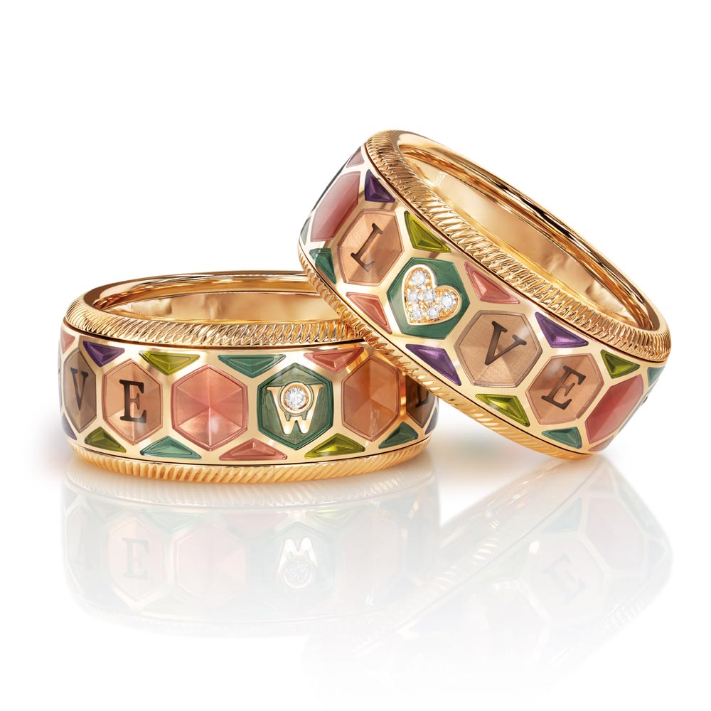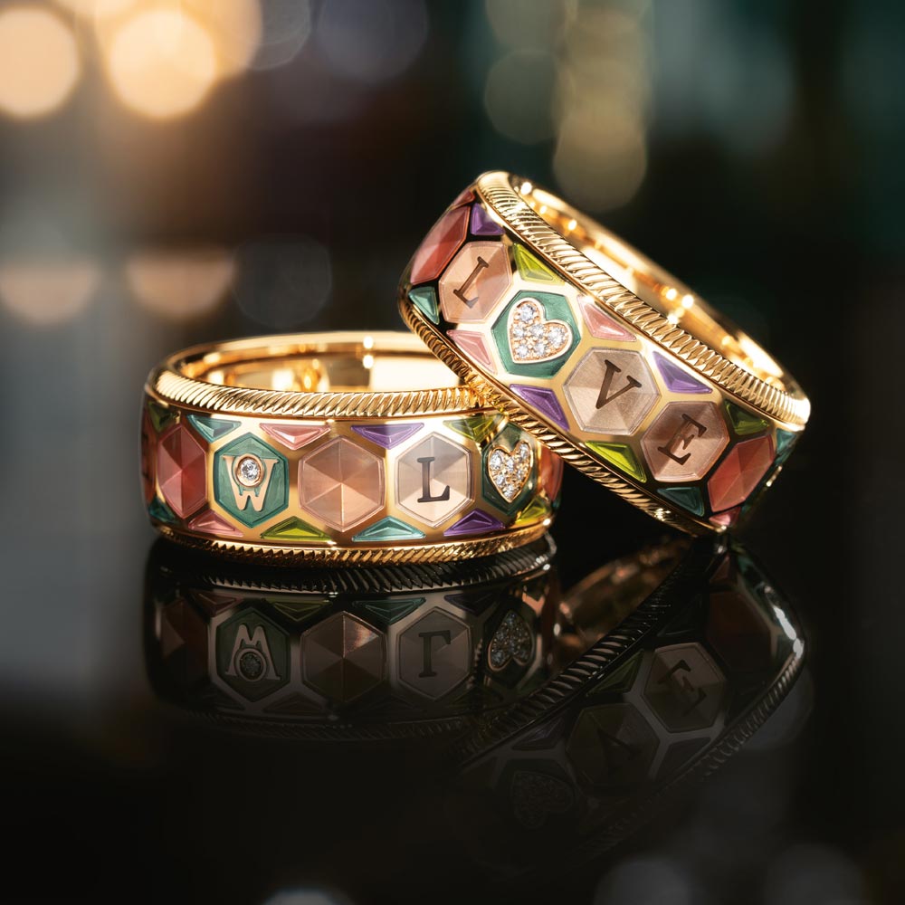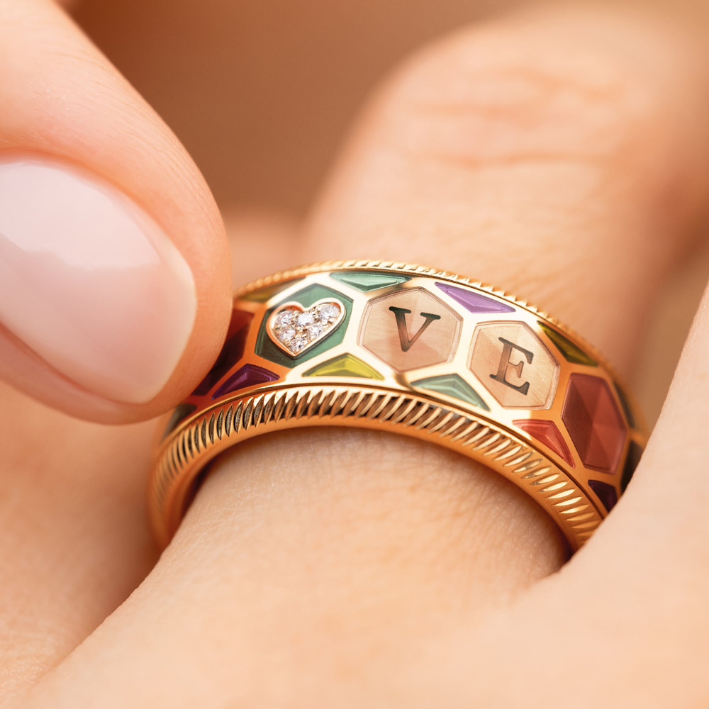 Der Jahresring 2026 „Aus Liebe.“ von Wellendorff ist auf 226 Exemplare weltweit limitiert und aus 18‑karätigem Gelbgold gefertigt. Ein Herz aus sechs Brillanten bildet das emotionale Zentrum und ersetzt im feinen „LOVE“-Schriftzug das „O“. Acht transparente Kaltemaillefarben – von Petrol über Nude bis Violett – bringen die 48 Flächen des Rings zum Leuchten.