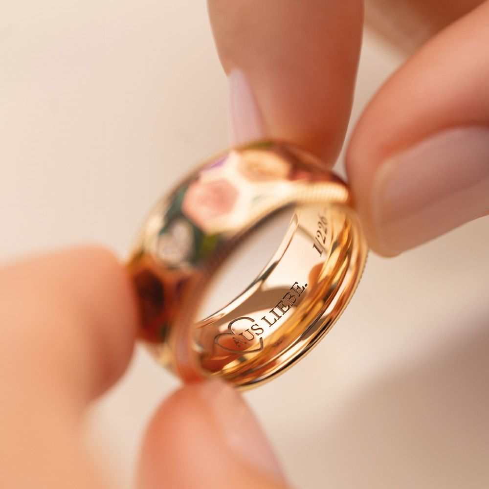 Strahlender Jahresring 2026 Aus Liebe. gefertigt aus 18‑karätigem Gelbgold und sanft drehbar für ein spielerisches Tragegefühl. Acht transparente Kaltemaillefarben von Petrol bis Violett verleihen eine faszinierende Tiefe. Ein Herz aus sechs Brillanten setzt einen emotionalen Akzent im feinen „LOVE“-Schriftzug. Das kunstvolle Wabenmuster fängt Licht und Schatten ein und lässt den Ring bei jeder Bewegung neu aufleuchten. Weltweit auf 226 Exemplare limitiert.